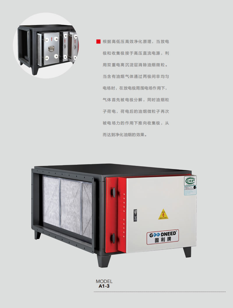 根据高低压高效净化原理,当放电极和收集极接于高压直流电源,利用双重电离沉淀层消除油烟微粒。当含有油烟气体通过两极间非均匀电场时,在放电极周围电场作用下,气体首先被电极分解,同时油烟粒子荷电,荷电后的油烟微粒子再次被电场力的作用下推向收集极,从而达到净化油烟的效果。