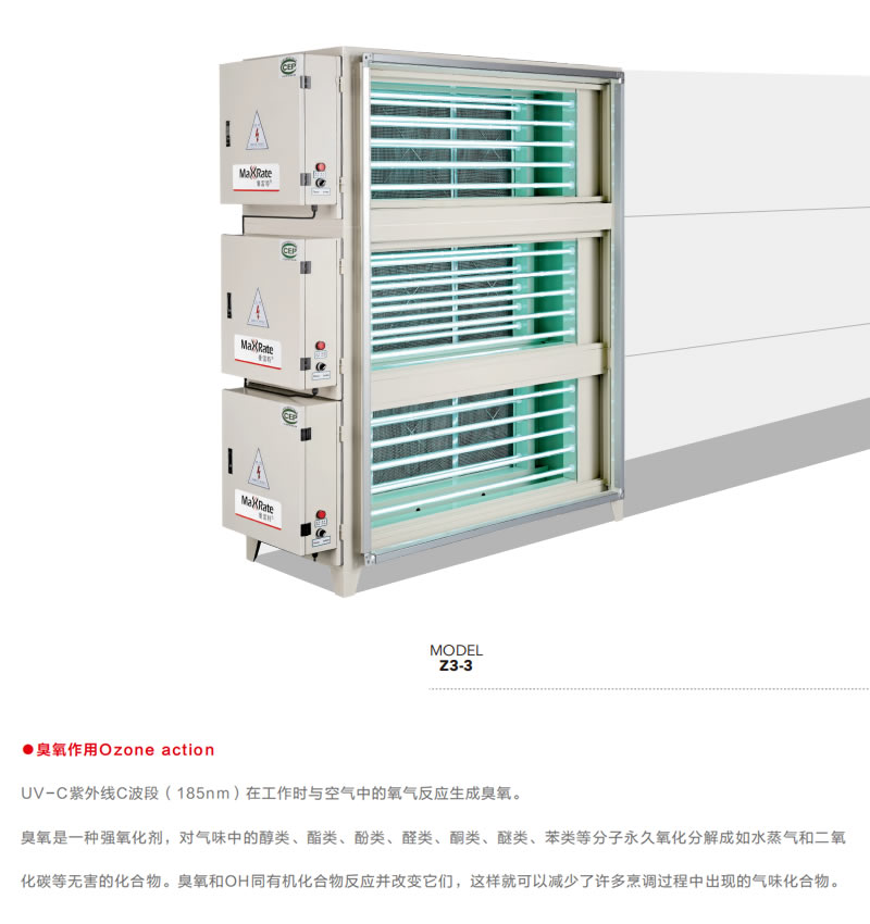 UV-C紫外线C波段(185nm)在工作时与空气中的氧气反应生成臭氧。臭氧是一种强氧化剂,对气味中的醇类、酯类、酚类、醛类、酮类、醚类、苯类等分子永久氧化分解成如水蒸气和二氧化碳等无害的化合物。臭氧和OH同有机化合物反应并改变它们,这样就可以减少了许多烹调过程中出现的气味化合物。