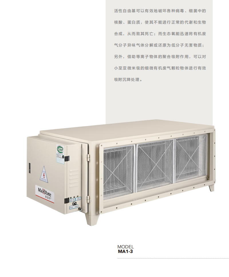活性自由基可以有效地破坏各种病毒、细菌中的核酸、蛋白质,使其不能进行正常的代谢和生物合成,从而致其死亡;而生态氧能迅速将有机废气分子异味气体分解或还原为低分子无害物质;另外,借助等离子物体的聚合吸附作用,可以对小至亚微米级的细微有机废气颗粒物体进行有效吸附沉降处理。